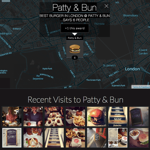 Find the best X in Y. Give awards with cute badges. One of the first apps to harness Instagram location images.